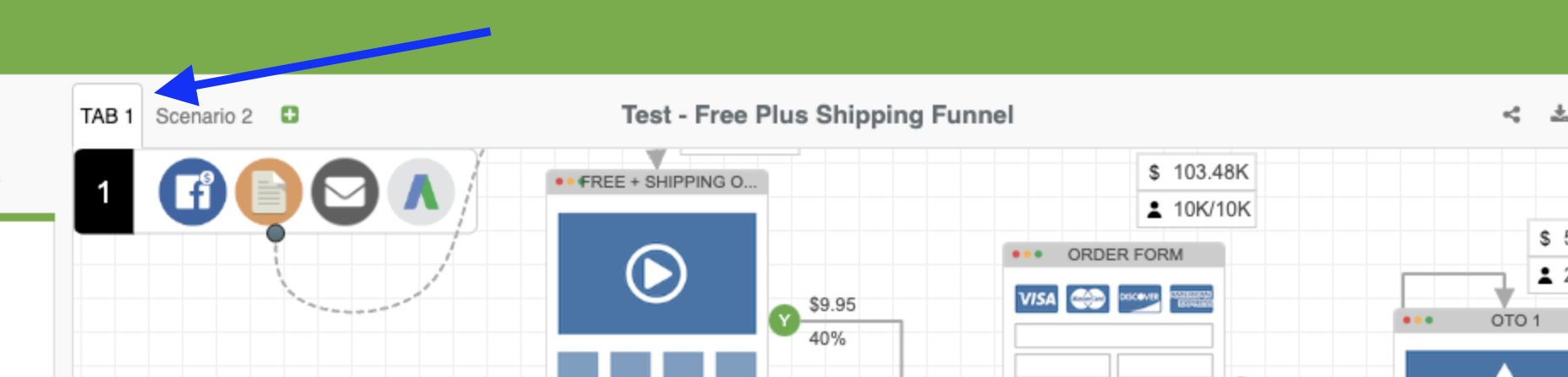 Once you have completed your funnel map in the first tab, you can test out other scenarios without needing to re-add all the objects to test out a new scenario. You can simply duplicate the canvas and then make changes to the duplicate to create a new simulation/test.